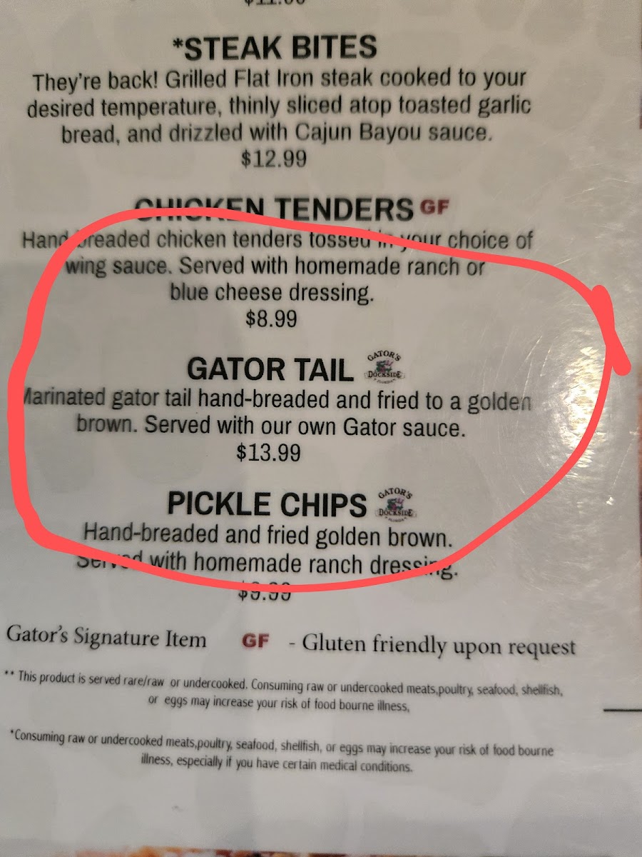 Hand cut gator tail marinated, hand battered, then deep fried, served with our own Gator Sauce.