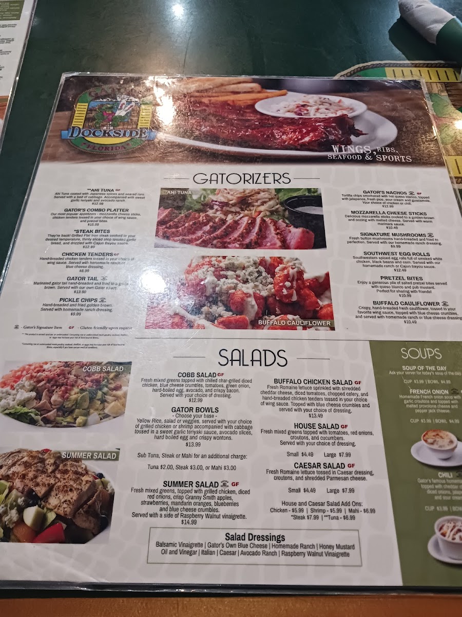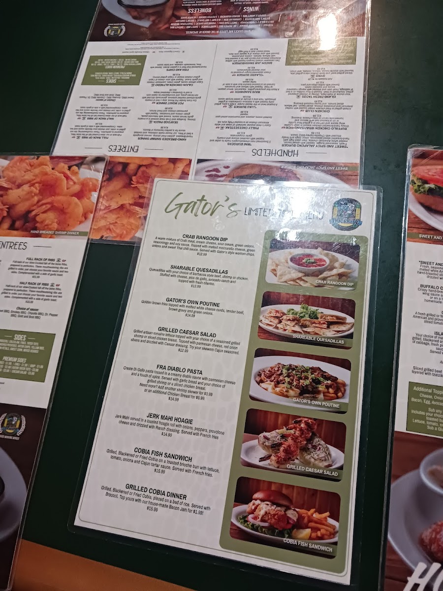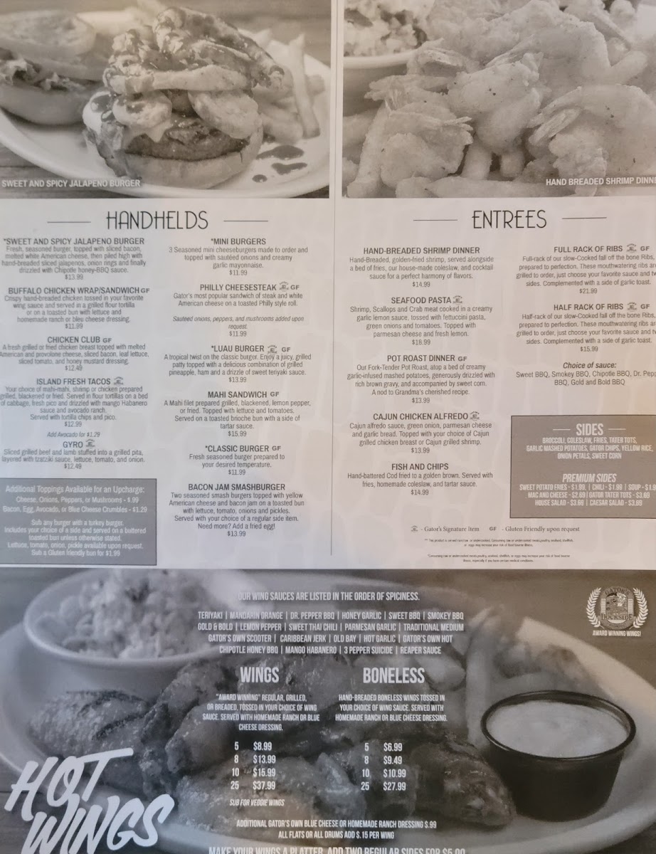½ Rack of Ribs served in choice of flavor and 5 Wings tossed in choice of wing sauce. Served with your choice of two sides, garlic Bread and Gator’s Own Bleu Cheese or homemade ranch.