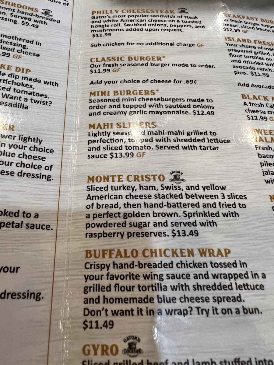 Fresh chicken breast battered, fried and tossed in YOUR FAVORITE wing sauce. Served on a toasted Kaiser roll with a side of Gator's Own bleu cheese dressing.